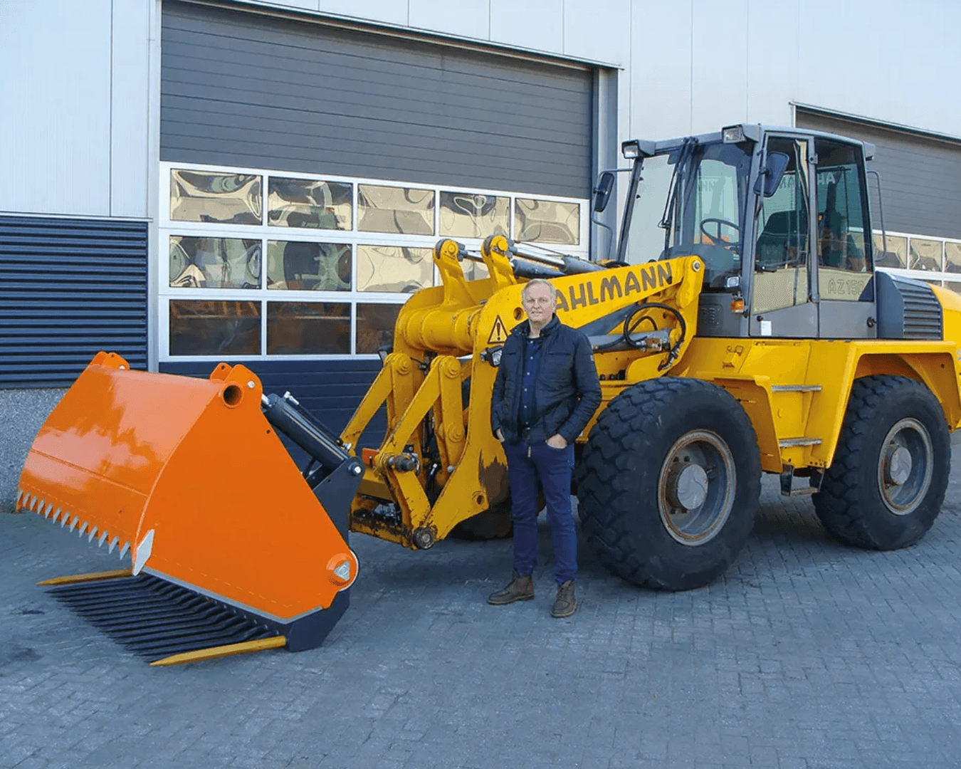 Je hoeft niet meer van de shovel af om een bak te wisselen. Je kunt gewoon blijven zitten, want het gaat met een knopje vanuit de cabine. De slangen worden onder druk ontkoppeld en weer gekoppeld. Schoon, veilig en gemakkelijk. Dat draagt bij aan ergonomie, werkvreugde en tijdwinst. Ik hoef het niet te promoten, want zien is geloven en kopen.”