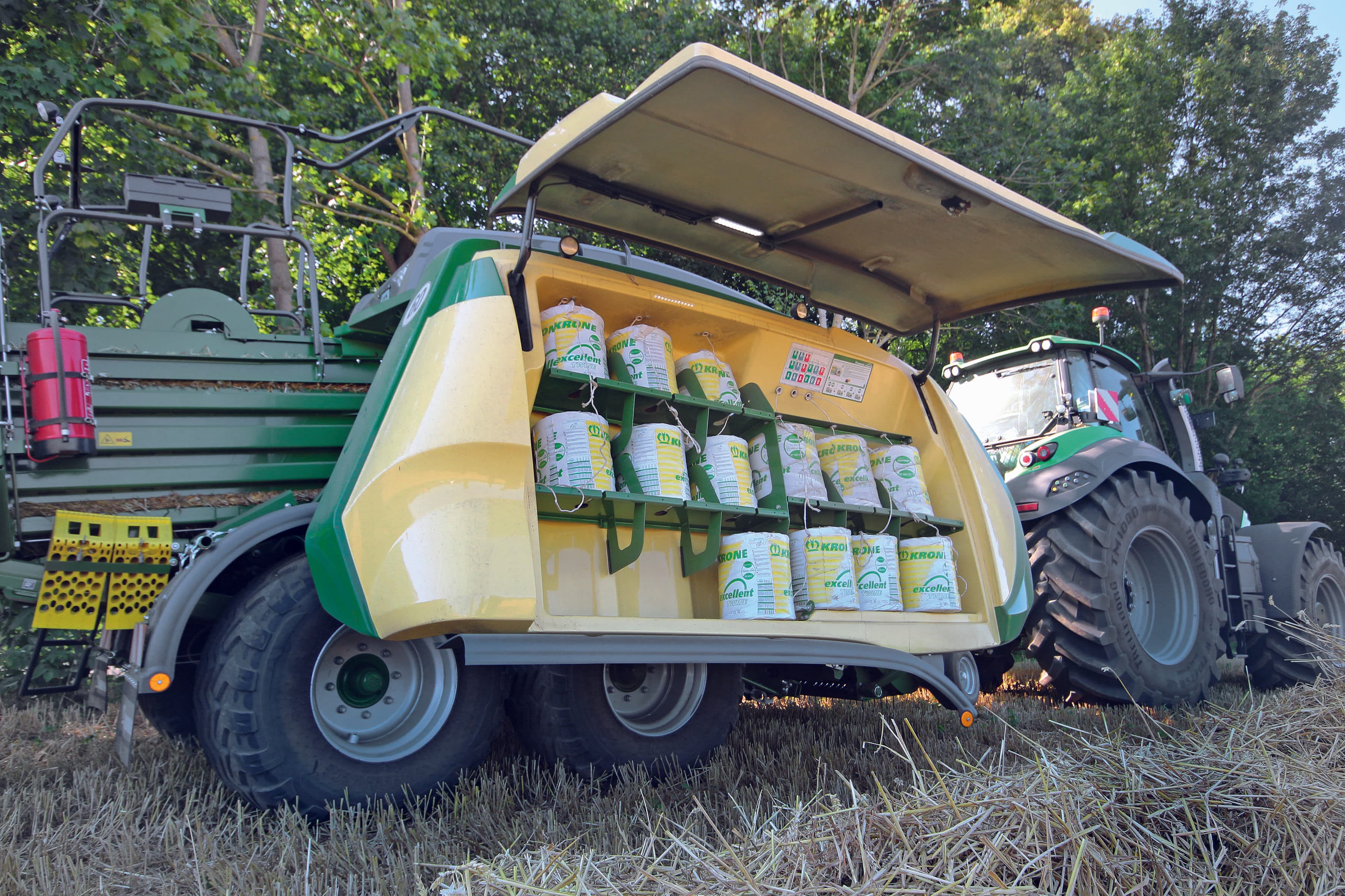 Met een modern extern bedieningspaneel (eveneens nieuw) kun je de bindtouwkasten naar boven toe openklappen. Je kunt dan makkelijk bij alle componenten erachter voor onderhoud en schoonmaken. Door ze te laten zakken naast het onderstel kun je de twee kasten gemakkelijk voorzien van in totaal 30 touwrollen. De kunststof deksels zijn zonder gereedschap te openen en goede afdichtingen houden de kasten vrijwel stofvrij, heel fijn! Een knoopschema en de led-verlichting vergemakkelijken het werk. Nieuw in het aanbod van Krone zijn de 15 kilo zware touwrollen, die volgens de fabrikant circa 40% meer touw bevatten.