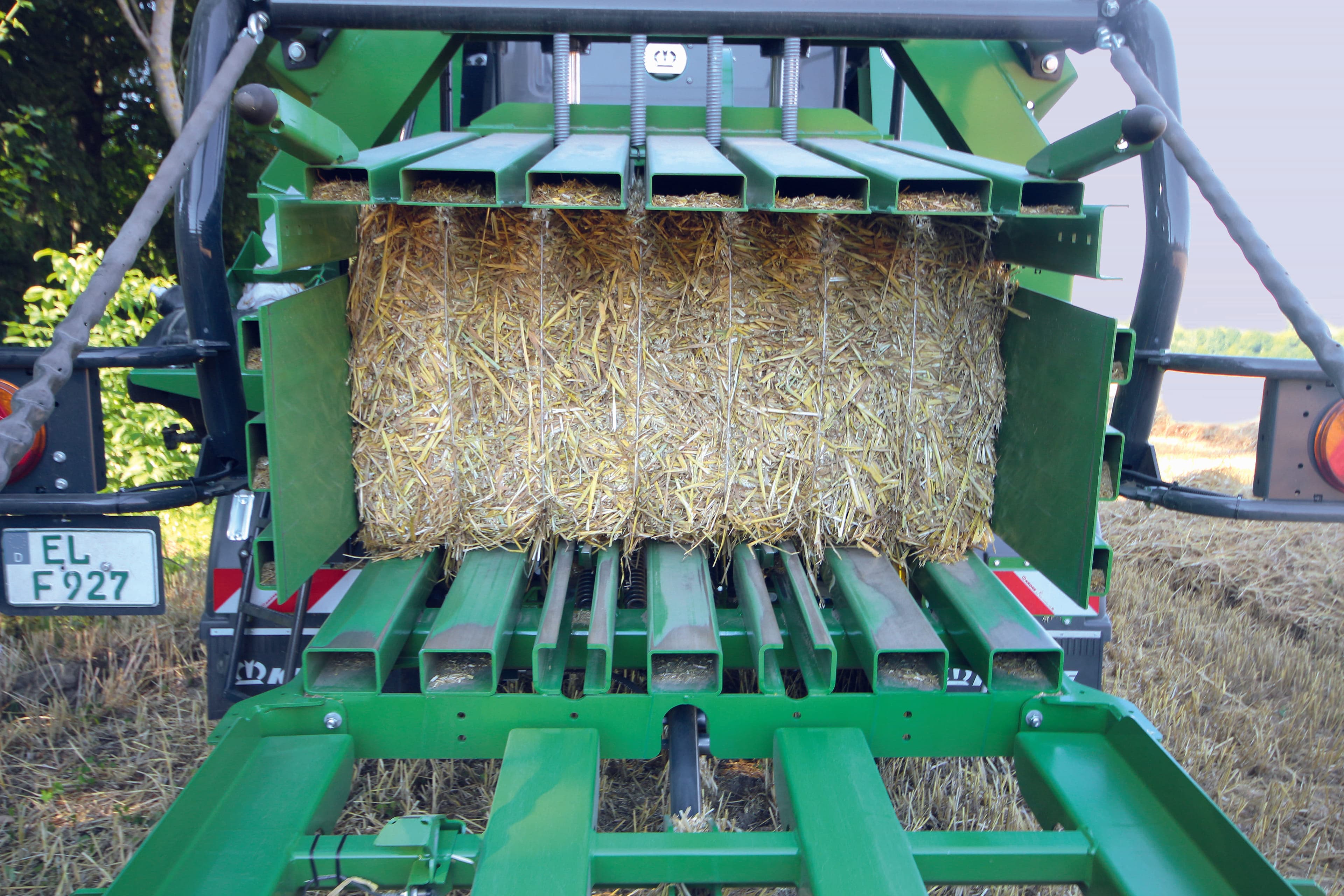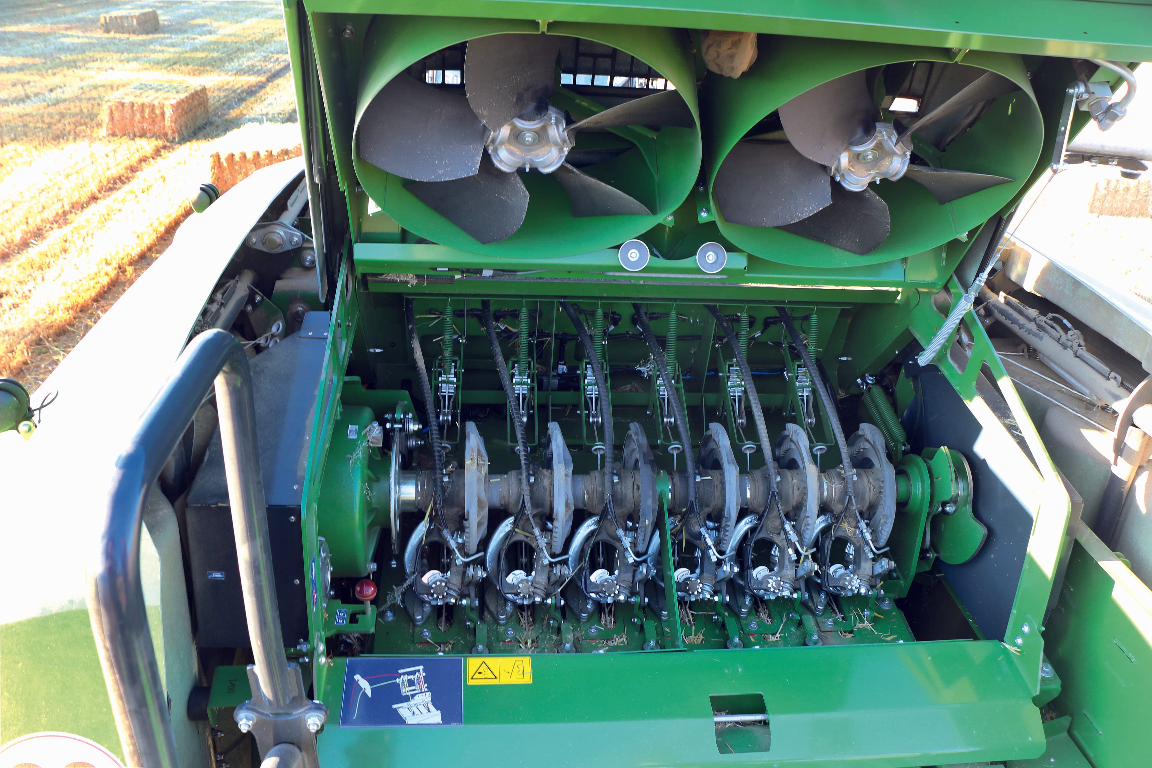 Aangekomen in het perskanaal treffen we de grote plunjer met 45 slagen per minuut. Zoals gezegd is de kanaalmaat 120 x 70 centimeter. Ten opzichte van de Highspeedmachine met dezelfde kanaalmaat is het kanaal 80 centimeter langer. Volgens Krone zorgt dat voor een betere baalvorm en een tot 15% grotere baaldichtheid. Krone past onveranderd de dubbele-knopertechniek toe met separate boven- en onderbindtouwen – helaas nog met knipsnippers. Met ‘MultiBale’ duidt Krone op de mogelijkheid met deze uitrusting om de grote vierkantebalen te verdelen met tussentouwen. Je hebt de keus tot maximaal negen deelbalen (van minstens 30 centimeter). We hebben dit systeem medio 2017 al uitgebreid op de testbank gehad. Een erg mooie nieuwigheid is de Krone PowerClean, het systeem met de hydraulisch aangedreven luchtaanjagers boven de dubbele knopers. De twee ventilatoren zorgen voor een overdruk in de knoperzône, zodat er van buitenaf geen stof en organisch materiaal binnendringt, laat staan zich kan afzetten. De knoperruimte bleef daadwerkelijk heel schoon. De twee ventilatoren hebben zelfs zoveel blaaskracht dat ze alle onderdelen tot aan de assen en op het achterste perskanaal schoon houden.