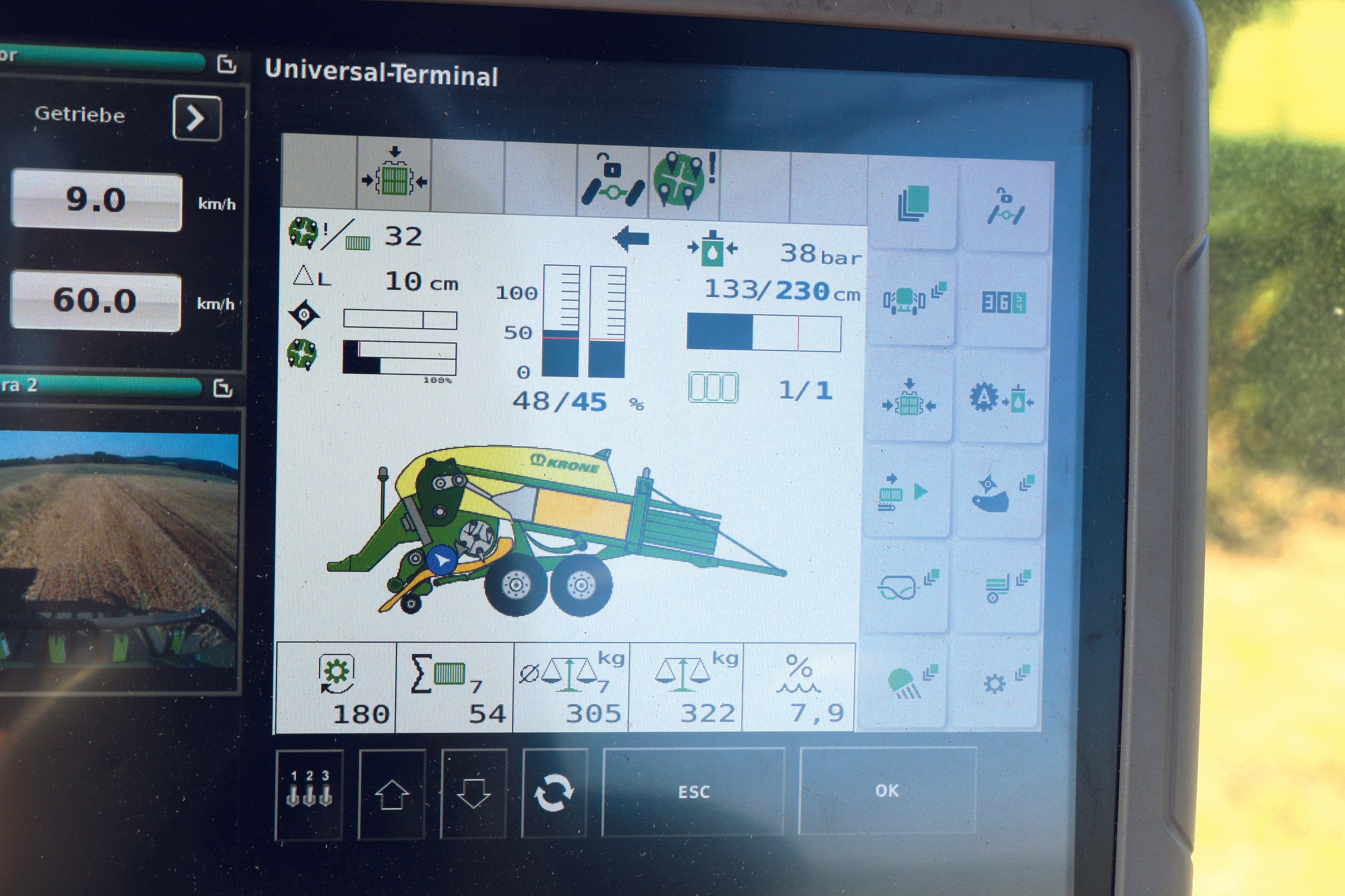 Niet alleen qua uiterlijk maakt de Krone BiG Pack 1270C een sprong voorwaarts, ook de wijzigingen in het voorperskanaal zijn veelbelovend. De chauffeur kan daarbij op comfortabele wijze instellingen doen. We reden met de BiG Pack 1270 VC.